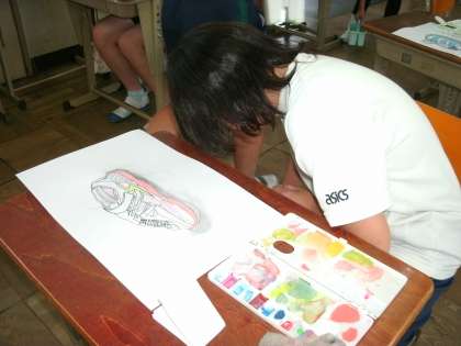 靴の絵を描きました。サインペンで上から描きうすく色をつけていくとなかなかすてきな絵になりました。次は,直接サインペンで描いていきます。