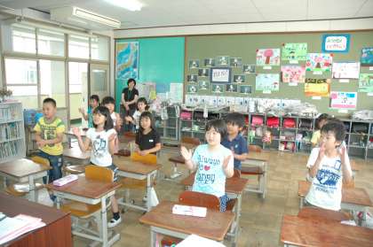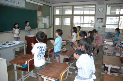 「今週の朝の歌」は,音楽の時間に学習した「こいぬのビンゴ」です。歌いながらリズムに合わせて手拍子をします。1番から5番まで歌う中で,手拍子のタイミングが変わるので,楽しくリズムを打ちながら一日が始まります。