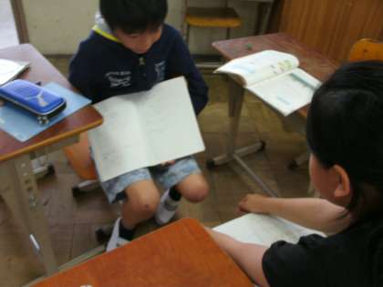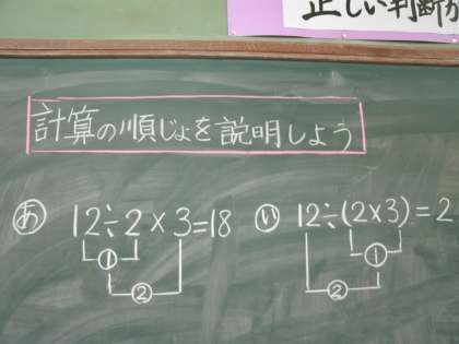 算数の時間には,( )を用いた式や足し算,引き算,かけ算,わり算がまざった式を正しい順序で計算するきまりについて学習しています。問題を解いた時には,どのような順序で計算をしたのか,説明し合うことで理解を深めていきたいと思います。