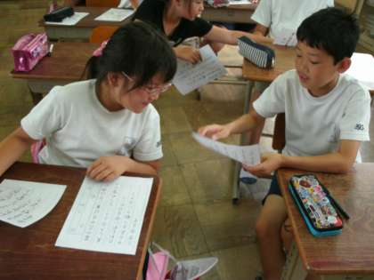 サインペンを使って,文字を整えて書く学習をしました。正しい姿勢を意識し,心を落ち着かせて文字を書くことができました。書いた作品は,友達と見せ合い,よいところを交流しました。