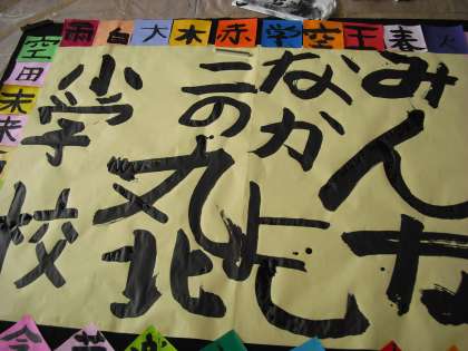 書道教室の後半は、大きな紙に一人一文字「みんな仲良し…」と寄せ書き。