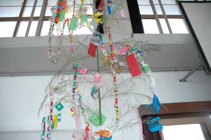 明日の「6月集会」で発表する笹飾りが完成しました。体育館にはグループごとに笹飾りが立ててあります。2年生,ひとりひとりが書いた願い事も飾られています。明日の集会で見てください。