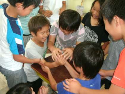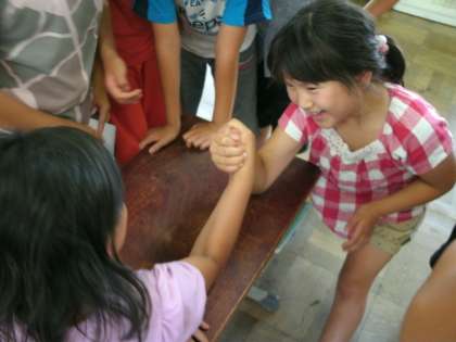 お昼休みに,「みんな遊び」で「うでずもう大会」をしました。相手の手をにぎりしめ,真剣な表情の子どもたち。とっても,盛り上がりました。