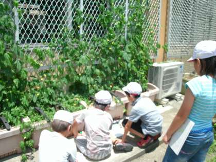 理科の学習で育てているツルレイシがどんどん大きくなっています。5月に苗を植えた時には,20cmぐらいだった苗が,いまでは,約3mほどの大きさになっています。黄色小さな花もたくさん咲いていました。