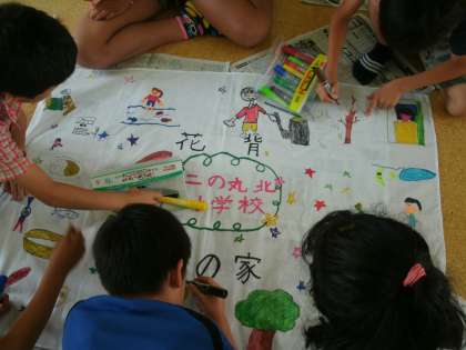 山の家に持っていく旗をみんなで作っています。真ん中の絵は,リーダーの子どもたちがかきました。そのまわりには,自分の名前や山の家で活動する様子の絵を一人一人の子どもたちがかきました。入所式の時に山の家で,この旗をあげます。