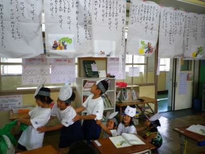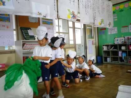 「おおきなかぶ」を学習しています。順番に,すべての役を演じながら,自分でセリフを考えて言っています。「うんとこしょ,どっこいしょ」の声も大きくなってきました。