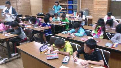 花背山の家 1日目の活動を終え,家族への手紙を書いています。