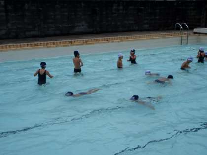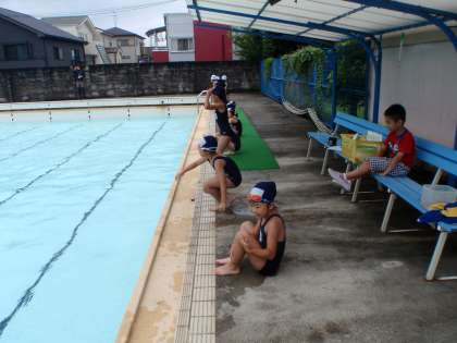 朝方,雨が降っていたので,入水できるかどうか心配していました。曇り空で照りつけるような日光はなく,肌寒いのですが,子どもたちの気持ちが勝ち入水しました。プールでは「伏し浮き」や「蹴伸び」などの技に挑戦しました。