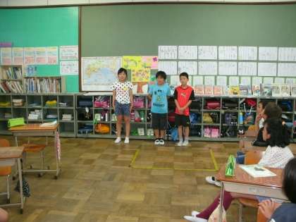 掃除時間が終わった後,10分間の帯学習を行っています。帯学習の時間には,短歌や俳句を暗唱し,みんなに聞こえるような大きな声で読むことをめあてにがんばっています。聞いている人に,場面の様子が伝わるような読み方もできるようになってきました。