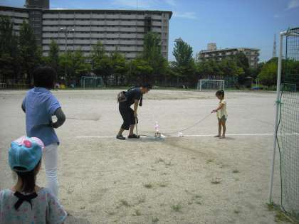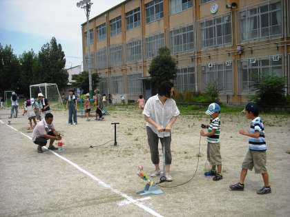 空高く飛ばそうと,おうちの方々も汗をかきながら,空気を入れていただきました。ロケットが勢いよく発射されると,子どもたちの歓声が運動場に響いていました。