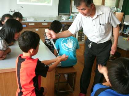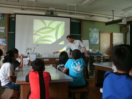 坂東先生に来て頂き,田んぼやビオトープの水辺に住む生き物についてお話を聞きました。「ボルボックス」「ミカヅキモ」などの小さな生き物の生態のおもしろさについて知ることができました。スライドで見たり,実際に手のひらにのせてもらったりして観察しました。