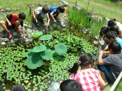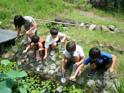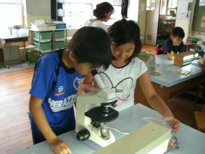 坂東先生のお話の聞いた後,みんなでビオトープに行き,水辺にすむ小さな生き物をとりに行きました。自分でとった小さな生き物を顕微鏡で観察しました。動きまわる生き物の様子や色の美しさに子どもたちは,喜んでいました。
