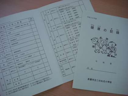 本日お子さまに「けんこうのきろく」をお渡ししています。4月〜6月までの健康診断の結果を記載しています。