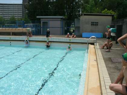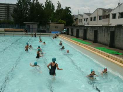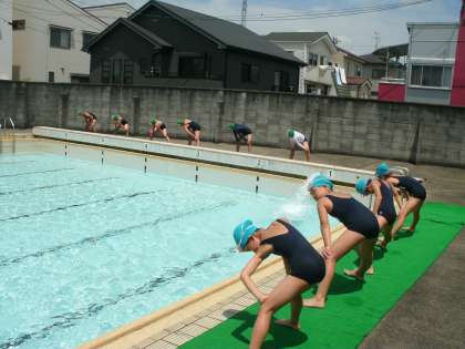 3年生といっしょに水泳学習を行っています。準備運動の時には,4年生が前に出て,号令をかけます。準備運動をした後には,プールの中を歩いたり,浮いたりして水慣れをします。その後は,グループごとに学習を進めています。