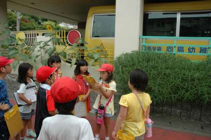 校区探検で,それぞれお気に入りの場所を見つけて紹介しました。向島幼稚園の卒園生が紹介してくれました。教室は暖かく,甘い匂いがするそうです。園庭もお気に入りで,宝石のような光る物が落ちているそうです。