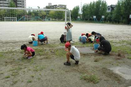 チャレンジ活動は,昨日が雨で順延になっていました。今日からスタートです。2年生もグループの一員として,がんばって草引きの活動をしていました。明日からも続きます。