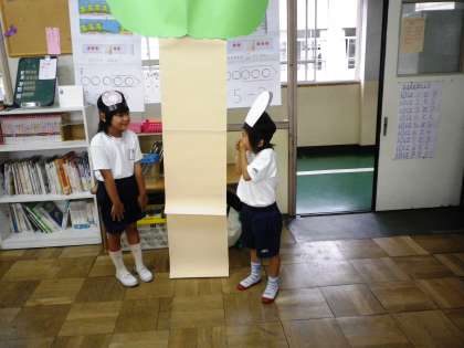「ゆうだち」というお話を学習しています。今日は,うさぎとたぬきのこになって,本文に書いてある通りに動きました。最後の場面では,みんなが笑顔になっていました。