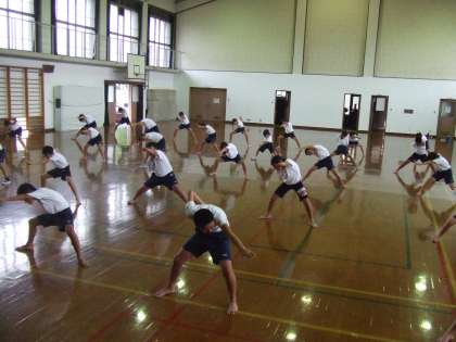 この波をあらわす動きや網引きの動きに加え,立つ座る動きがリズミカルに入ります。子供たちは,曲がなるたびに自分達のグループの踊る番でなくても踊っているので,汗だくです。よく頑張っています。