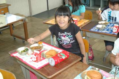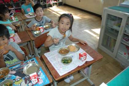 給食献立の「トマトシチュー」に星形の幸せニンジンを見つけることができました。ラッキーなニンジンを見つける度に歓声が上がりました。