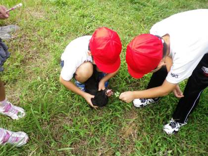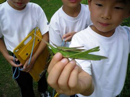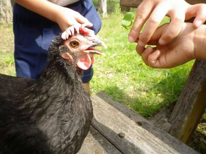 今日もチャボ小屋に行きました。どんどん,仲良くなっています。チャボたちもかわいい1年生が大好きなようです。バッタも見つけていました。