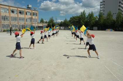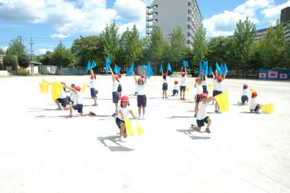 運動会まで,あと10日です。1・2年生の,小旗を使ったマスゲームは,だいたいできあがってきました。