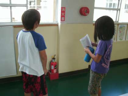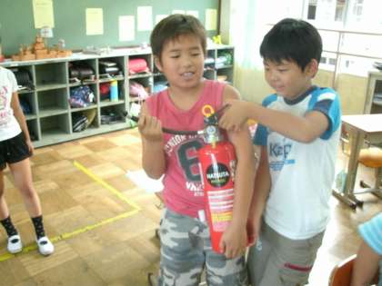 社会科の学習では,火災から人々の安全を守る工夫や努力について学習しています。今週は,学校の中にある防火設備に調べました。防火バケツや消火器が置いてあるところを探しました。また,実際に消火器をどのように使うのかについても学習しました。