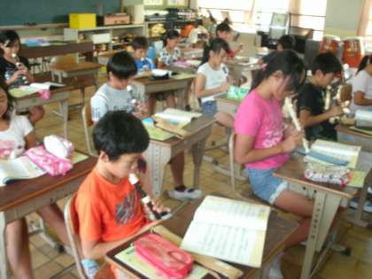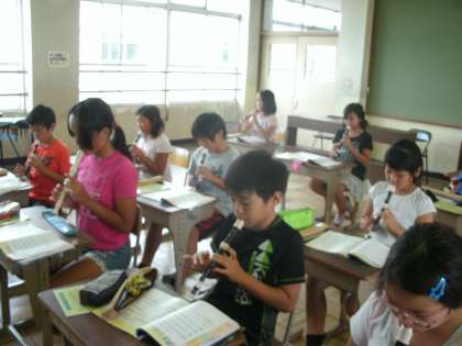 音楽の時間には,「ハローサミング」をリコーダーで演奏しています。この曲では,高い音の「ミ」がでてきます。練習するにつれ,高い音がきれいに出るようになってきました。また,曲全体が柔らかい音で演奏することもできるようになってきました。