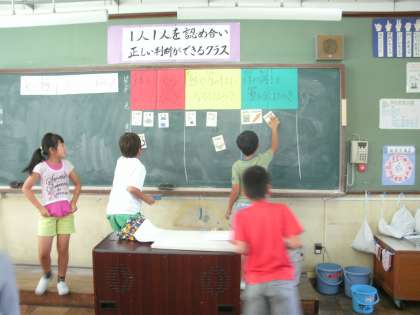 今日の4時間目は,食べ物のはたらきについて学習しました。内輪先生といっしょに,3つの栄養素(体をつくる・熱や体のもとになる・体を調子をととのえる)について学習しました。いろいろな食べ物がどのような栄養素にあたるのか,考えることができました。