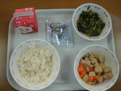 給食の献立は,「麦ごはん・牛乳・高野どうふと野菜のたき合わせ・ほうれん草ともやしのごま煮・じゃこ」でした。それぞれの食べ物の栄養素を考えながら,ランチルームでおいしく頂きました。