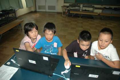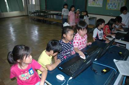 2年生が1年生にコンピュータの使い方を教えました。マウスの使い方を中心に教え,マウスゲームをして楽しみました。ペイントを使ってお絵かきもしました。緊張気味の2年生でした。