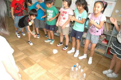 毎週水曜日の中間休みに行われる,遊び係による,みんな遊びは,ペットボトルボーリングでした。手作りのボールとペットボトルで簡単に遊べます。盛り上がっていました。