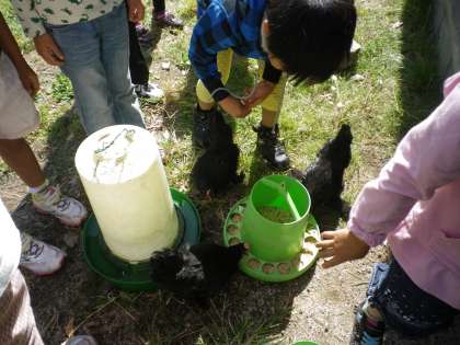 生活科の時間に,チャボ小屋に行きました。持って行ったごはん・白菜・キャベツ・パンを,どれもうれしそうに食べていました。水を飲んでいるところも観察することができました。