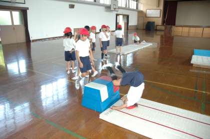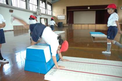 マット遊びの学習で,新しい技に挑戦しました。その技は「飛び前転」です。練習の場に,ソフト跳び箱を置いて,触れないようにしながら練習しました。