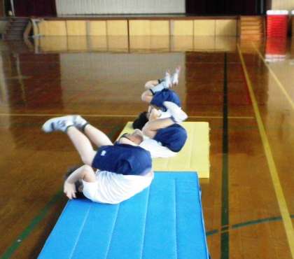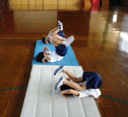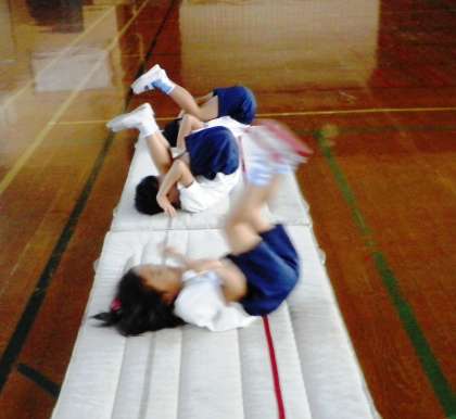 今日もマット遊びをしました。準備運動でしっかり「おそばやさんゆりかご」をし,手のつき方を練習したので,後転もできるようになってきました。