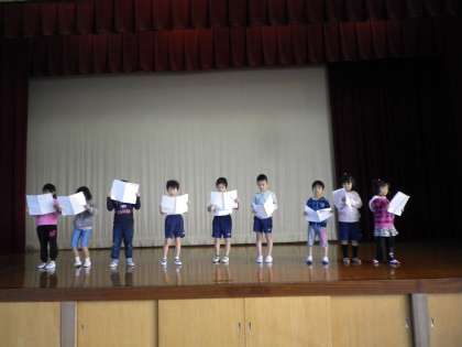 学習発表会に向けて,今日から練習を始めました。今日のめあては「ゆっくり,はっきり,大きな声で言葉を言う」ことです。大変上手にできていました。