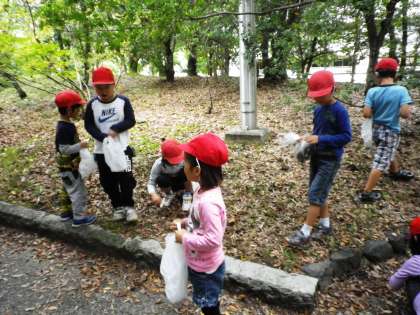向島中央公園にどんぐりひろいに出かけました。いろいろな葉っぱやどんぐりを集めることができました。