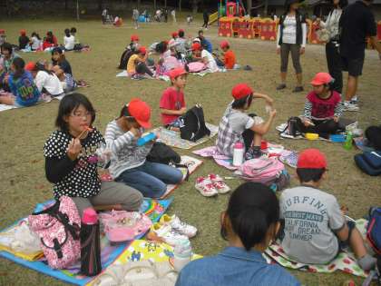 お昼は子供の楽園で食べました。暑いのに,木陰は雨上がりでじめじめしているしいやなようで,おもいっきり広場の真ん中にシートを広げていました。
