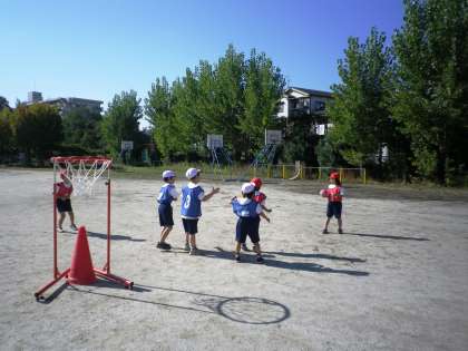 今日から,パスゲームは2チームが同じコートを使うルールで行いました。最初は戸惑っていたようですが,だんだん慣れてきて,自分から動いたり,相手のボールを取りに行ったりする姿が見られました。