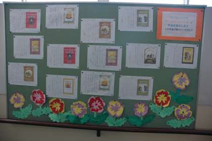 アーノルド=ローベルの作品のおもしろいところを紹介しました。本の表紙をコピーして分かりやすくしました。階段の掲示板に展示しています。これらを見ていると,紹介された本を読みたくなってきます。