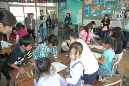 日本の隣の国である韓国の様子について学習しました。街の様子,家や衣服,生活の様子などあまり日本の様子と変わりません。子どもたちの遊びにも同じようなものがありました。そのひとつの「ユンノリ遊び」を体験しました。授業参観だったので,お家の人も一緒に楽しみました。