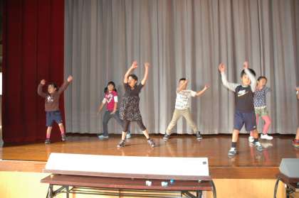 2回目の体育館での練習です。大きなステージをいっぱい使ってダンスをします。徐々に形ができてきました。
