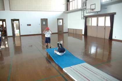 3週間ぶりに体育館でマット遊びの学習をしました。前転,後転,側転,それに飛び込み前転にも挑戦しました。