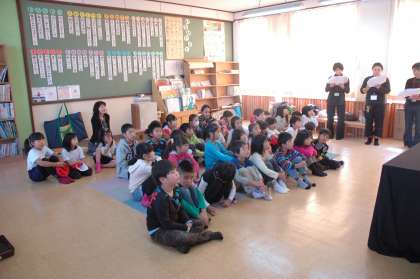 向島南小の図書ボランティアの方に,読み聞かせをしていただきました。中間休み,2年生は全員図書室に集まり話を聞きました。題名は「ぼくはおばけ」です。静かに聞いていました。