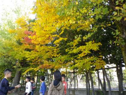 校庭の木々が美しく色づいています。きれいな色の葉っぱを集めました。