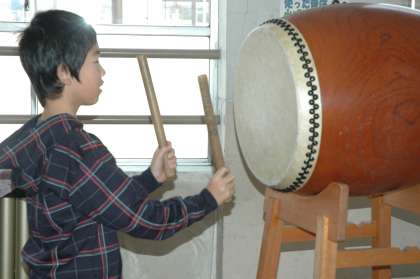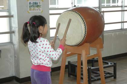 音楽の学習で「村まつり」を学習しています。曲の中に太鼓の音が入ります。それに合わせて太鼓をたたいてみました。初めてと思えないくらい上手にたたけました。