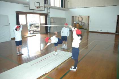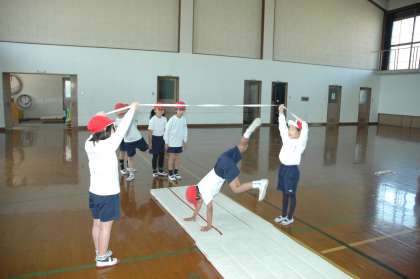 側転がうまくできるように,ゴム紐を使いました。ゴムを友達に持ってもらい,側転をした足が伸びているとゴムに足がかかります。足を伸ばすことを意識するので,きれいに回転することができました。
