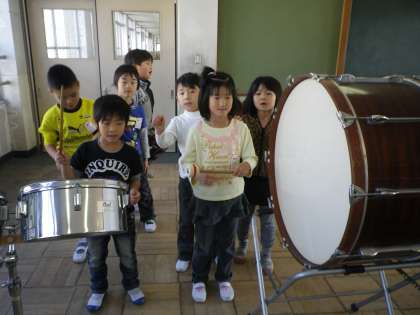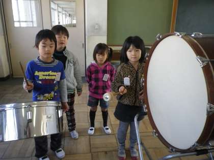今日は「オーレチャンプ」「かえるのうた」に合わせて,大太鼓と小太鼓をたたきました。初めてでしたが,よくリズムを覚えて演奏できました。