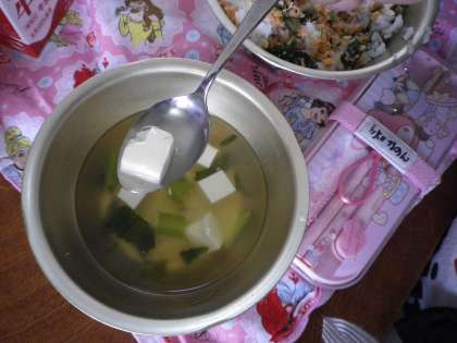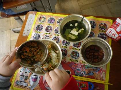 「くつの形になってるよ。」と,とうふの吉野汁の具を見せてくれました。まぜご飯の具も大好評で,時間までに全員が食べ終わっていました。