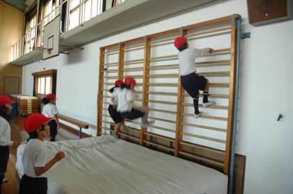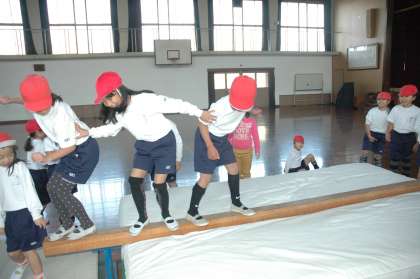 少し高いところからウレタンマットに飛び降りました。落ちても大丈夫です。この後,平均台の下に敷きました。落ちても安全なことが分かっているので,安心して平均台を渡りました。