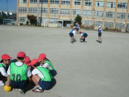 ポートボールの学習では,試合の前にどんな動き方をすればよいのか,自分たちで作戦を立てる時間をとっています。4年生がリーダーとなり,3年生といっしょに学習を進めています。